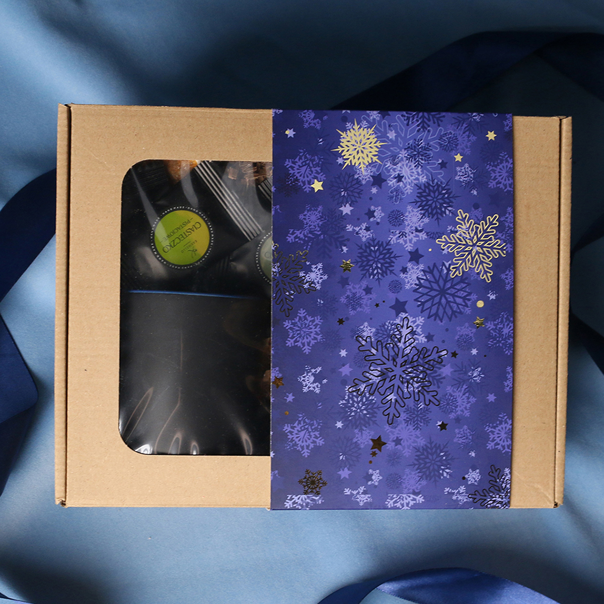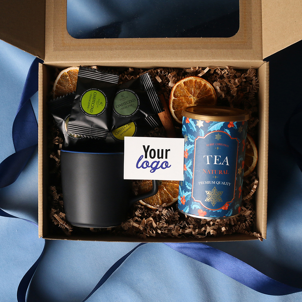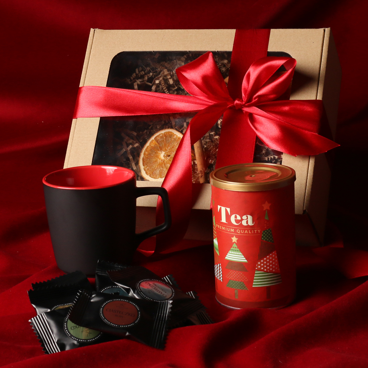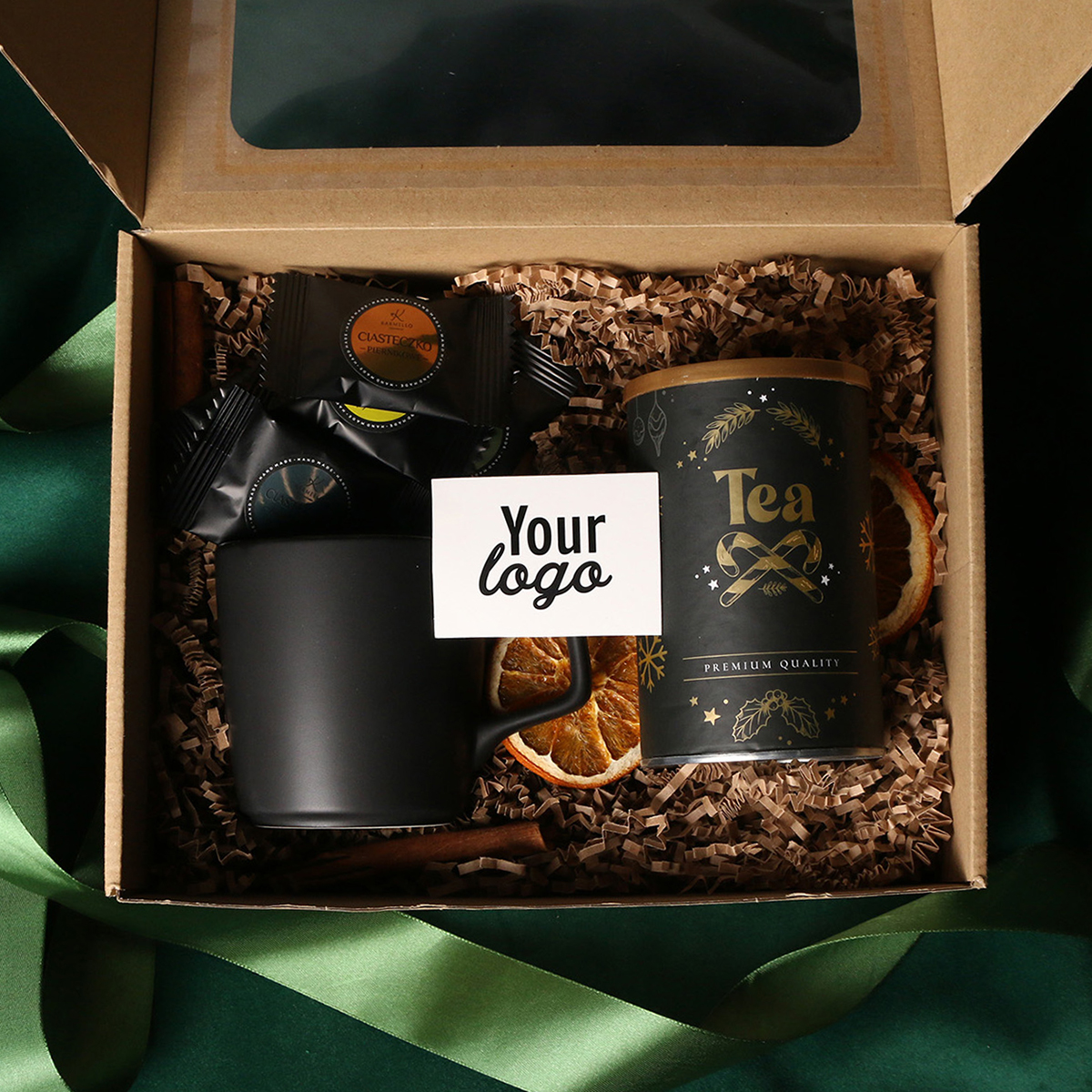 Zum Set gehören: Barrel Supreme-Becher schwarz-rot / schwarz-reflexblau / schwarz-schwarz mit Veredelungsmöglichkeit, grüner Sencha-Tee mit Kirschen und Rosenblättern, verpackt in einer Röhre mit winterlichem Motiv, 8 Stück Pralinen – gemischte Geschmacksrichtungen. Alles in einer stilvollen Eco-Kartonverpackung mit Sichtfenster. Zusätzliche Personalisierungsoptionen: Druck auf dem Becher, Anhänger mit Firmenlogo, Schleife oder Banderole mit winterlichem Motiv, veredelt mit Goldprägung.
