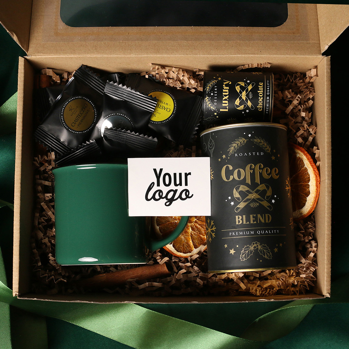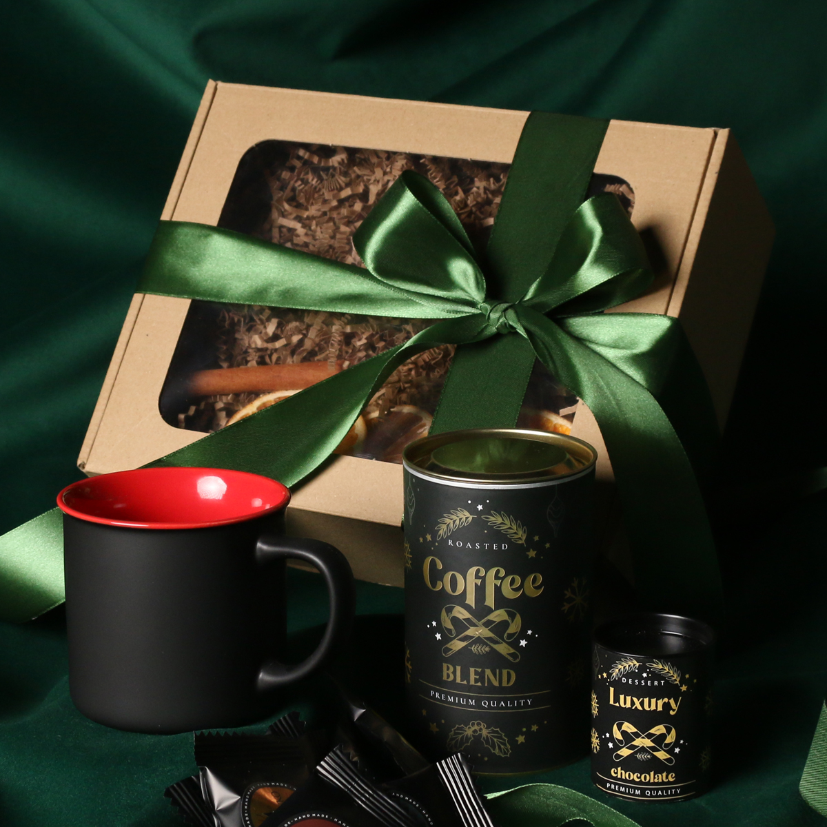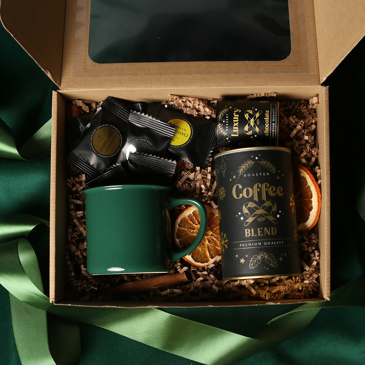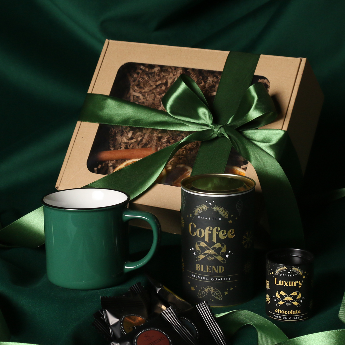 Loft-Becher in Dunkelgrün oder Loft Supreme in Rot und Schwarz Wärmende Belgische Trinkschokolade 40g Aromatischer Arabica Brazil Cerrado Mineiro Kaffeebohnen in 150g Dose Exklusive Studenten-Kekse 8 Stk. – Mix aus Geschmacksrichtungen Elegante Verpackungsdekoration: farblich abgestimmte Schleife oder Banderole