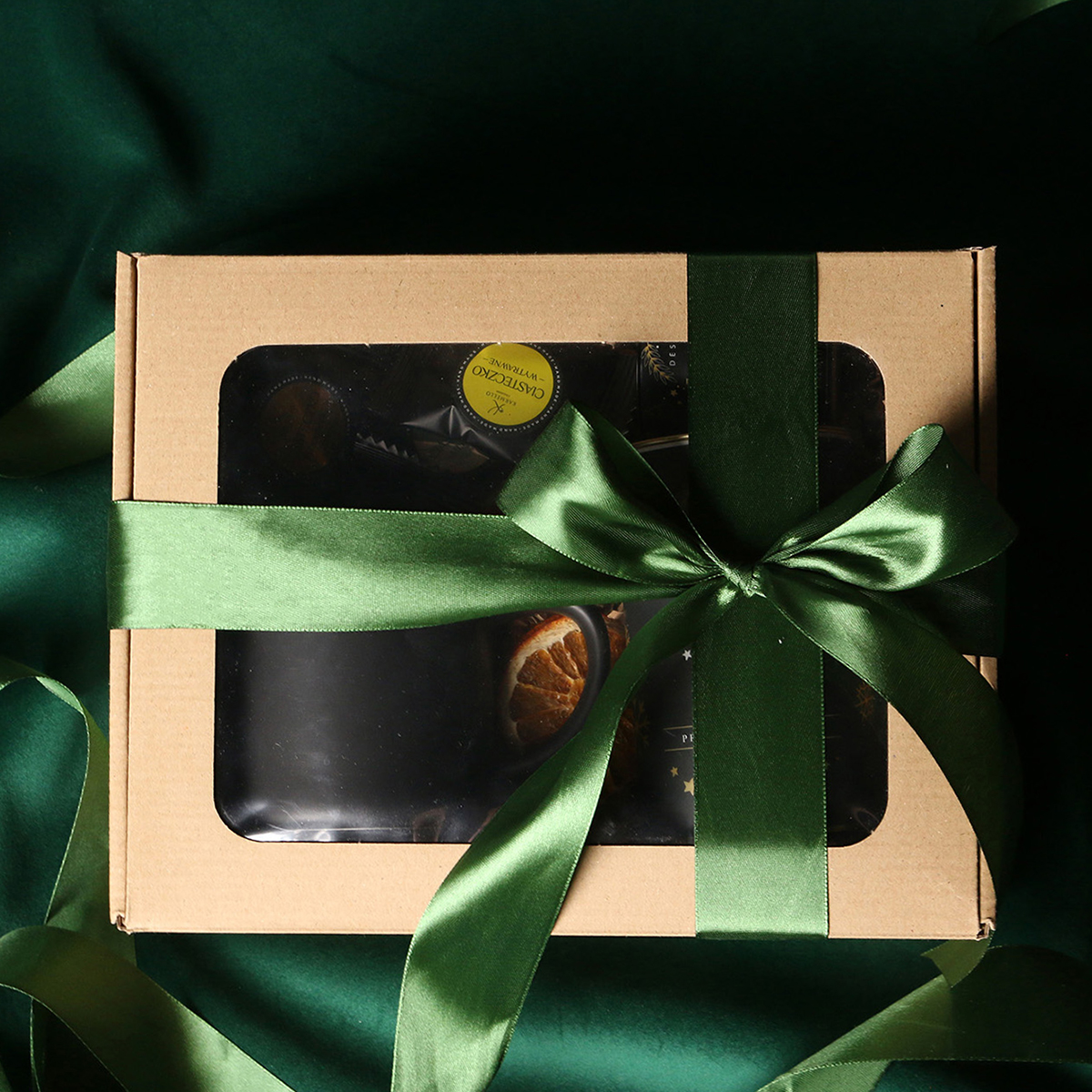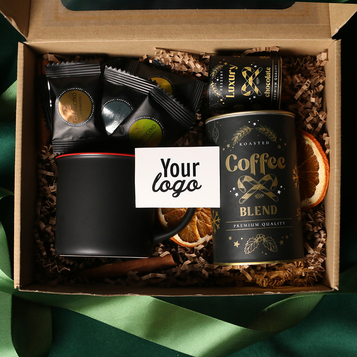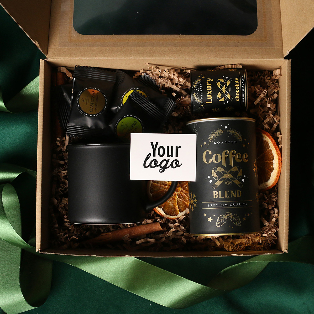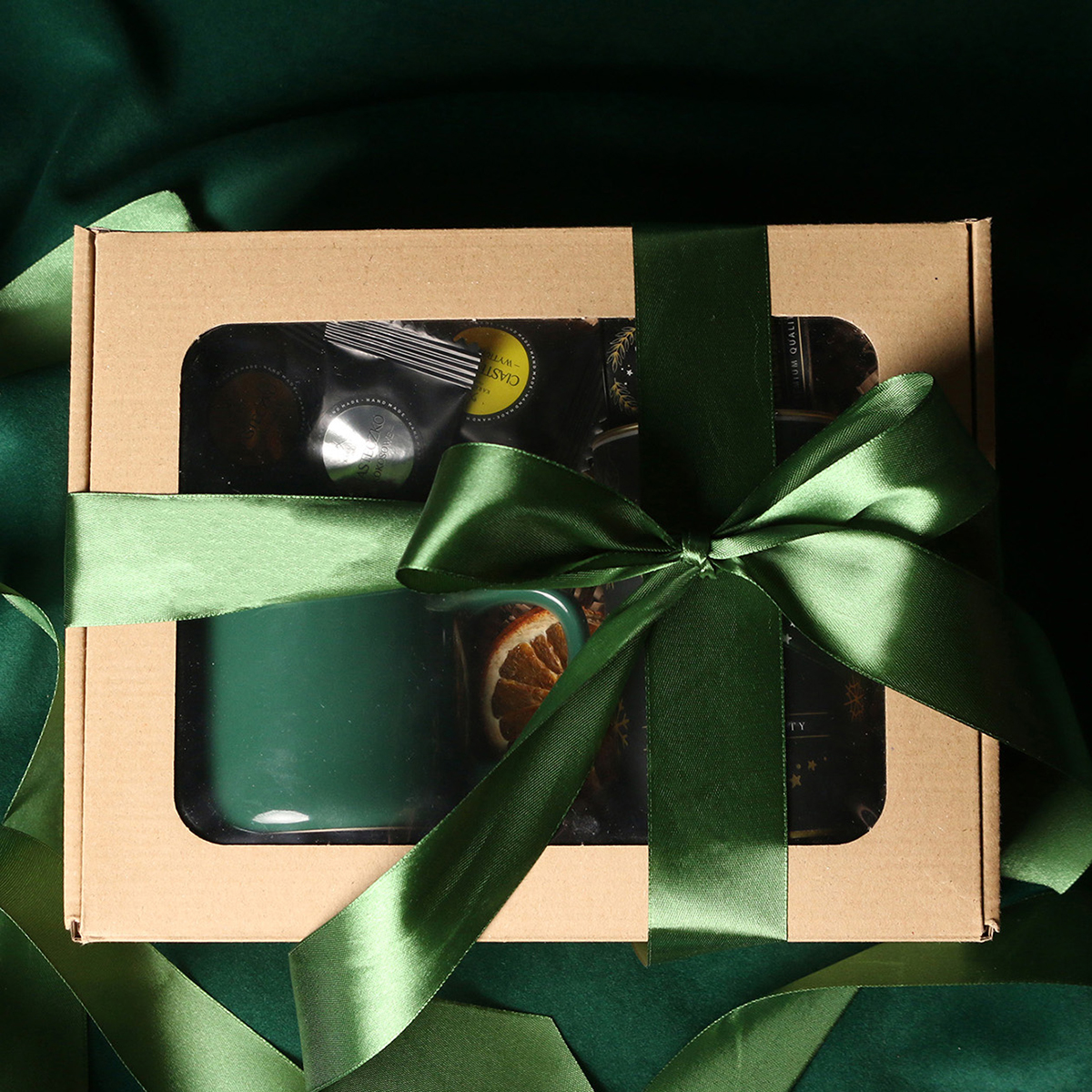 Loft-Becher in Dunkelgrün oder Loft Supreme in Rot und Schwarz Wärmende Belgische Trinkschokolade 40g Aromatischer Arabica Brazil Cerrado Mineiro Kaffeebohnen in 150g Dose Exklusive Studenten-Kekse 8 Stk. – Mix aus Geschmacksrichtungen Elegante Verpackungsdekoration: farblich abgestimmte Schleife oder Banderole