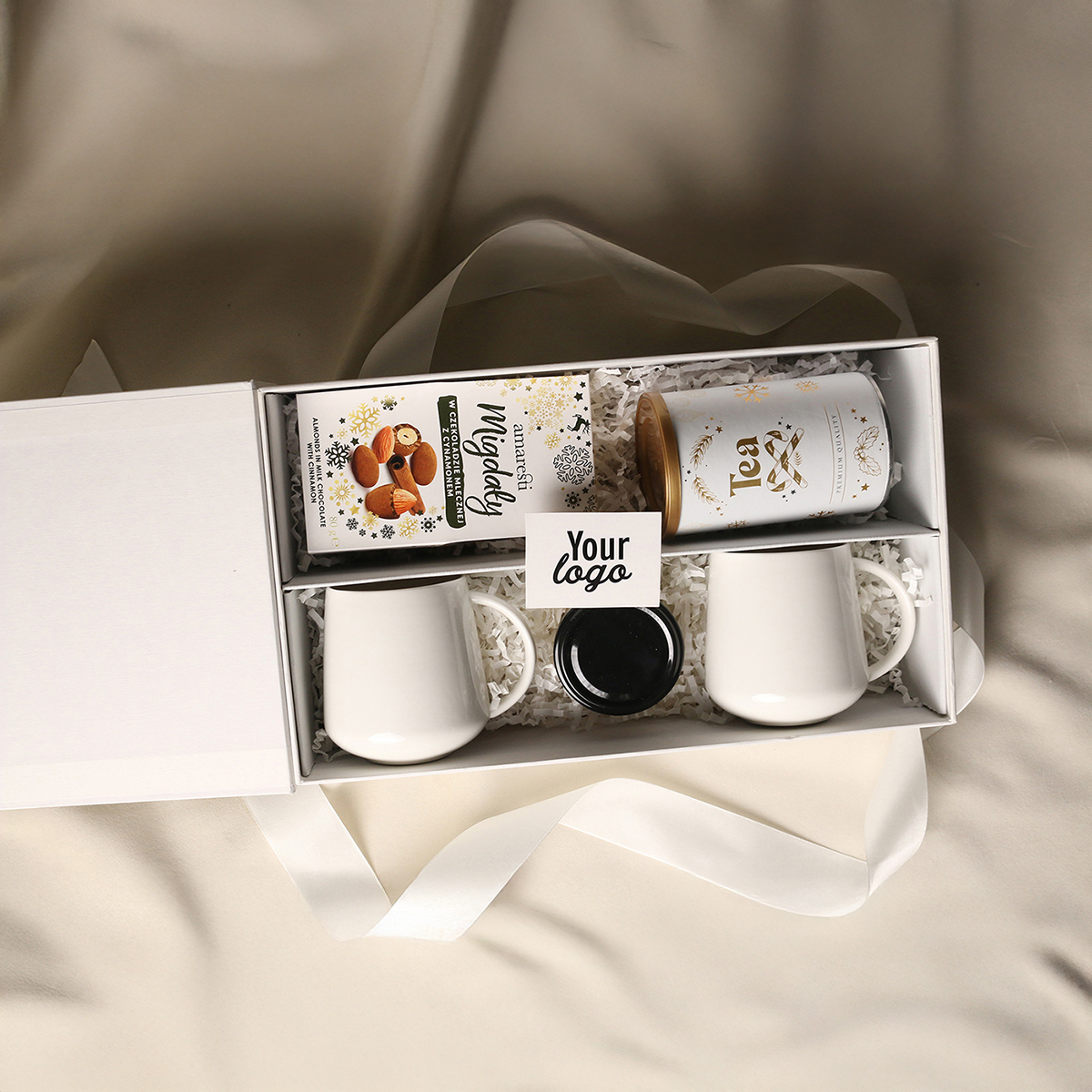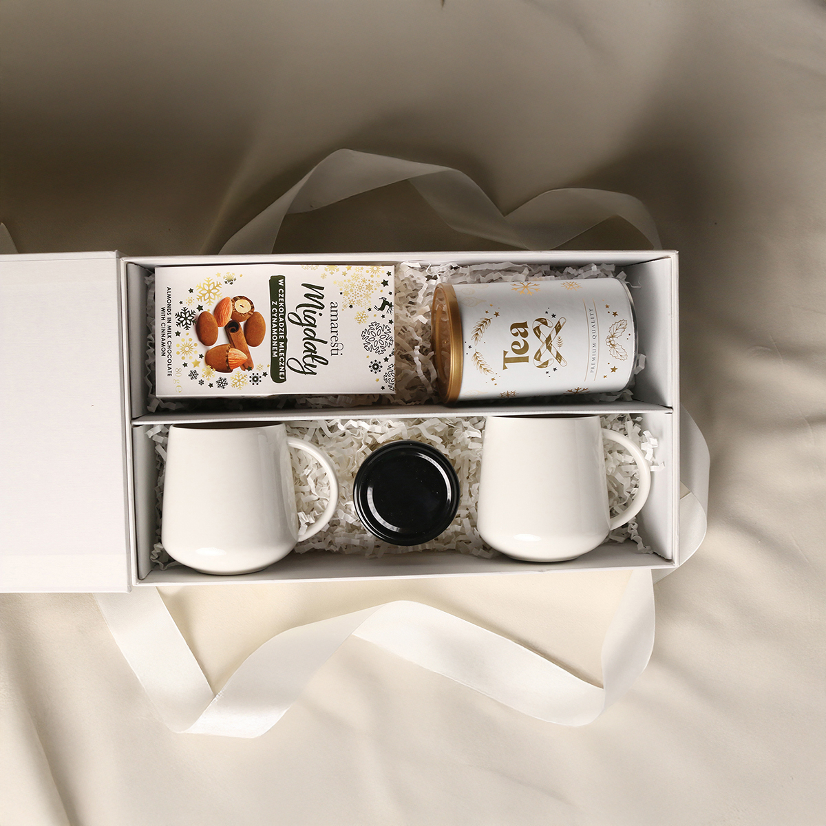 Elegante Melody-Porzellanbecher – 2 Stk. Süße Mandeln in Milchschokolade mit Zimt Aromatischer grüner Sencha-Tee mit Kirschen, Rosenblättern und Ginkgo-Biloba-Blättern 80g Natürlicher handwerklicher Blütenhonig 130g Exklusive Verpackung mit Magnetverschluss und Möglichkeit, passendes Band oder Banderole hinzuzufügen